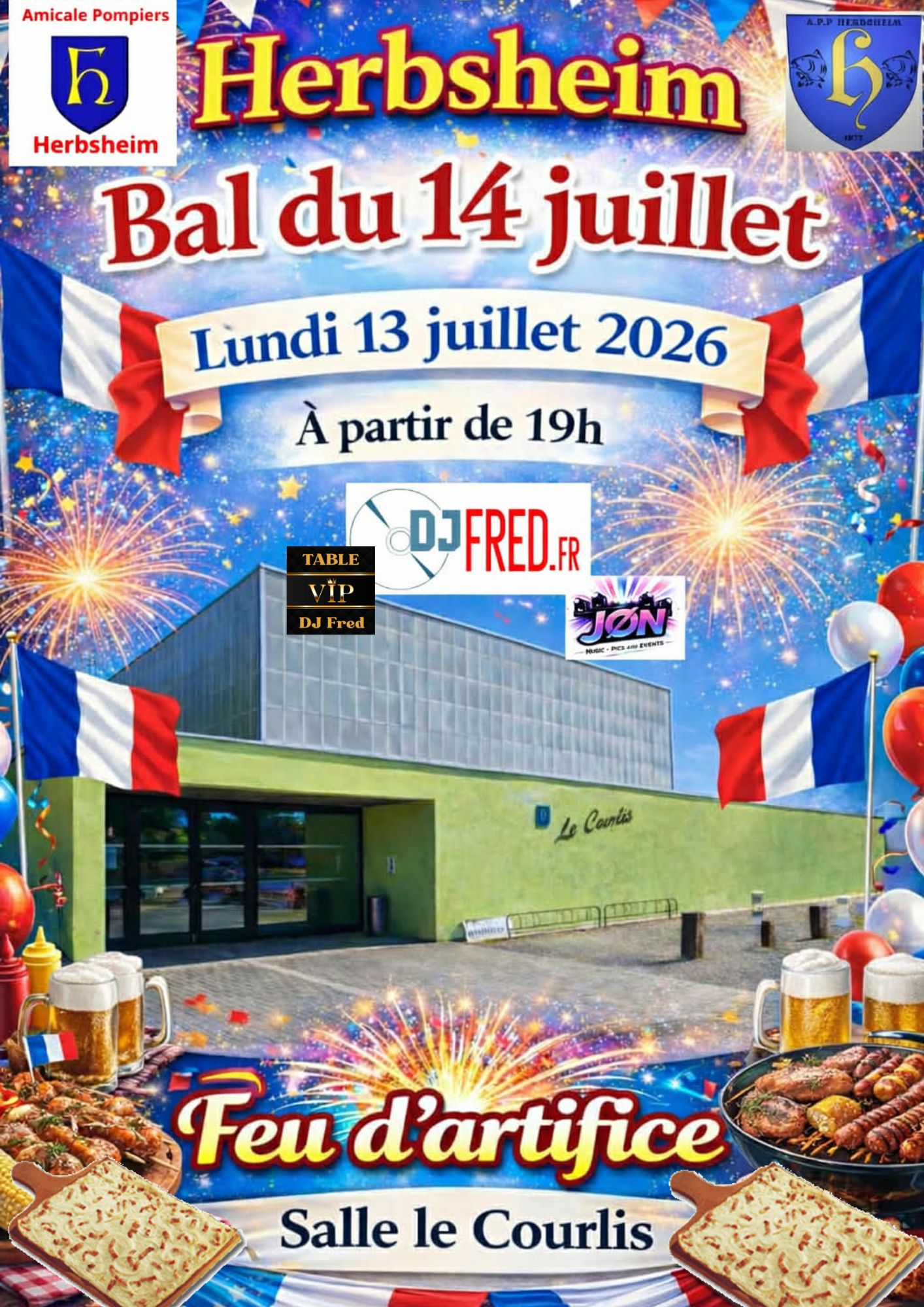 Rendez-vous le Lundi 13 Juillet à la Salle « Le Courlis » de Herbsheim pour le Bal du 14 juillet avec un Feu D’artifice au courant de la soirée. Fête animée par DJ Fred. L’entrée est Libre