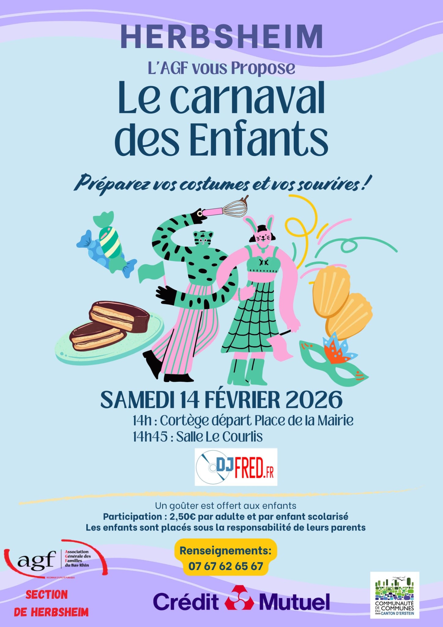14 février 2026 Carnaval des Enfants Herbsheim 11 décembre 2025 par Djfred Samedi 14 février 2026 Salle le Courlis à Herbsheim DJ Fred mettra le feu à la piste de Danse après le cortège Carnavalesque des enfants dans le village de Herbsheim pour la troisième année consécutive. 14h45 à 16h30
