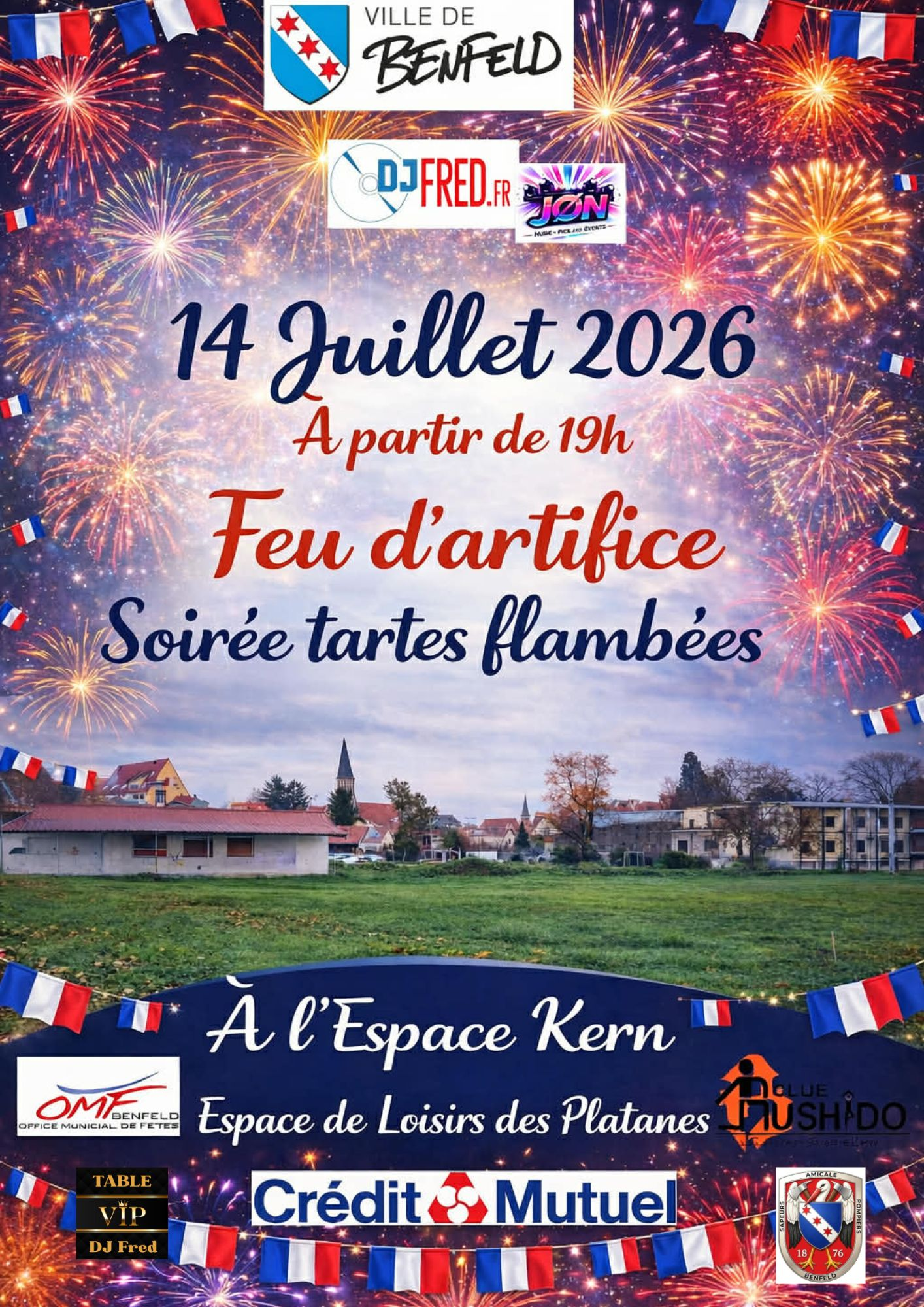 Feu d’Artifice : Le point culminant de la soirée sera un magnifique feu d’artifice tiré vers 23h. Un spectacle à ne pas manquer !Rendez-vous : Rue de la Digue (ancien stade Kern) BENFELD