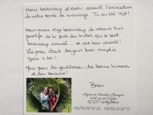 Nous voulions encore te remercier pour la magnifique soirée que tu nous a fais passer lors de notre mariage. Je pense que nous n’aurions pas pu rêver mieux.