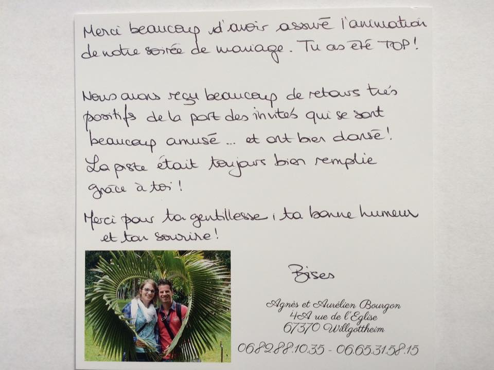 je tenais tout particulièrement à vous remercier pour ma soirée très réussie en grande partie grâce à votre talent de DJ et d’animateur.