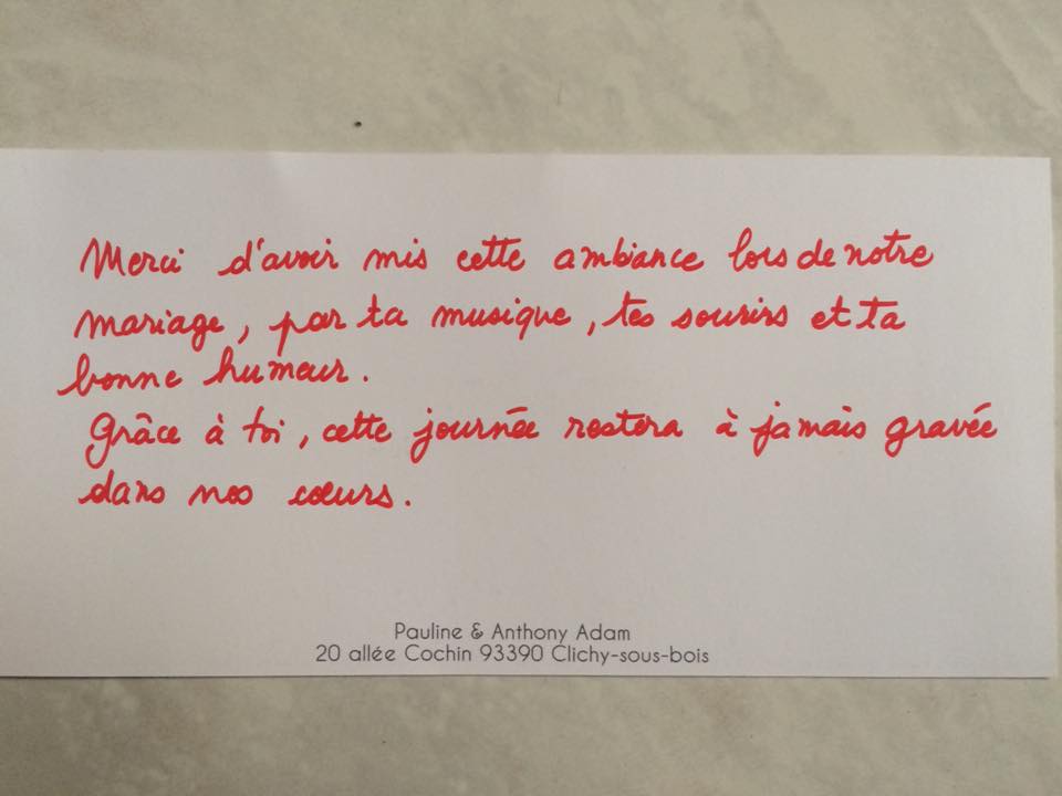 On voulait te remercier pour la soirée de notre mariage. C était au top! Tout le monde était ravi ! 😉