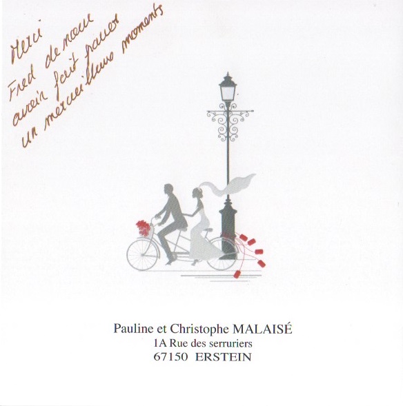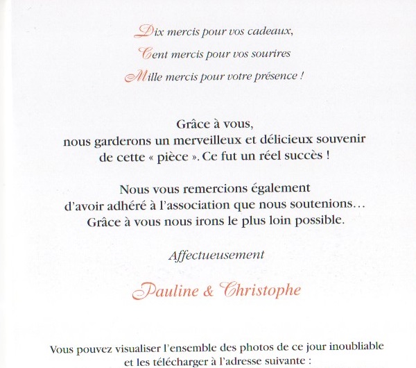 Nous voulions encore te remercier pour la magnifique soirée que tu nous a fais passer lors de notre mariage. Je pense que nous n’aurions pas pu rêver mieux.